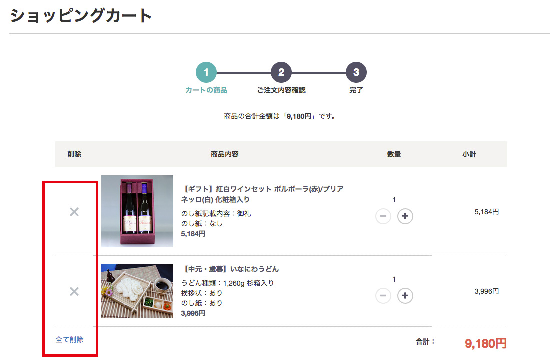 「×」ボタンか「全て削除」ボタンを押して商品を削除します。